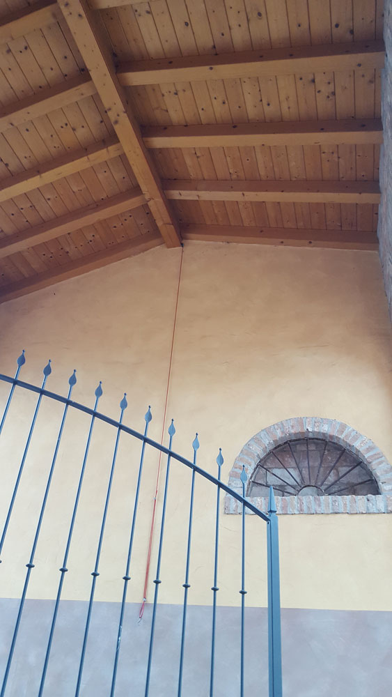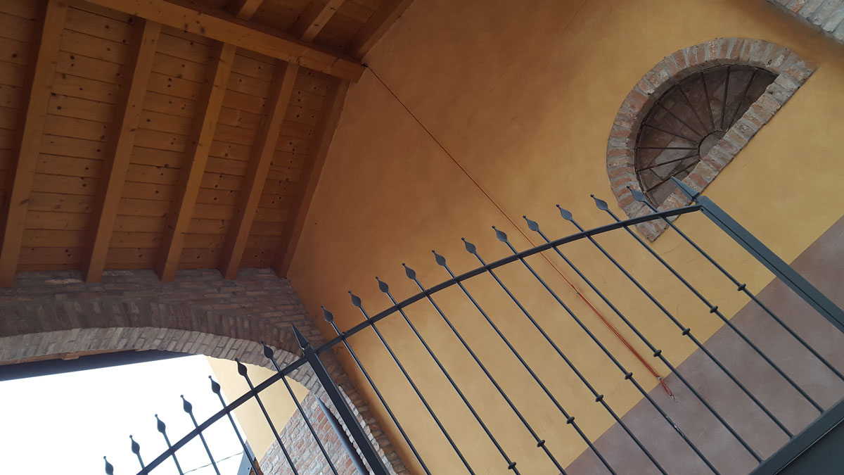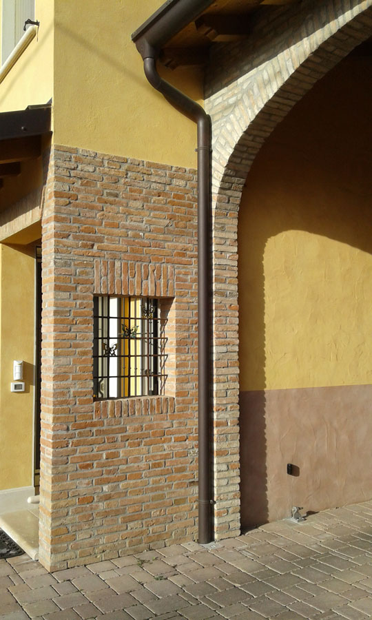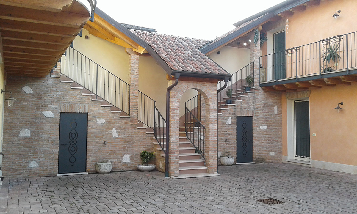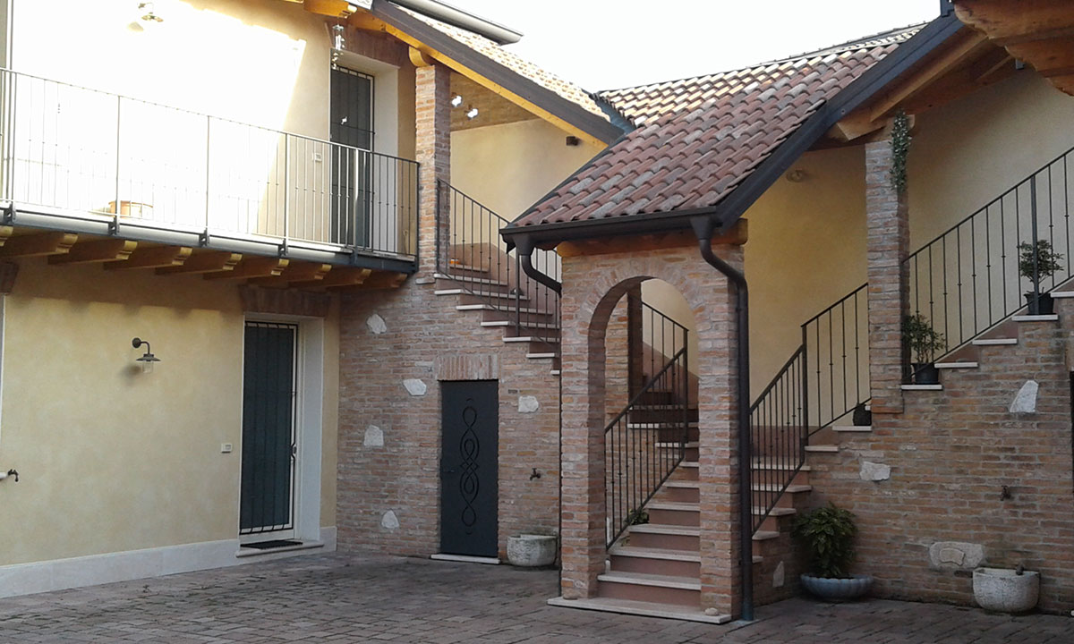 Il mattone unito al sasso e al legno, il cortile interno, il gioco di luci suggestive serali creano un'armonia e un senso di casa famigliare.